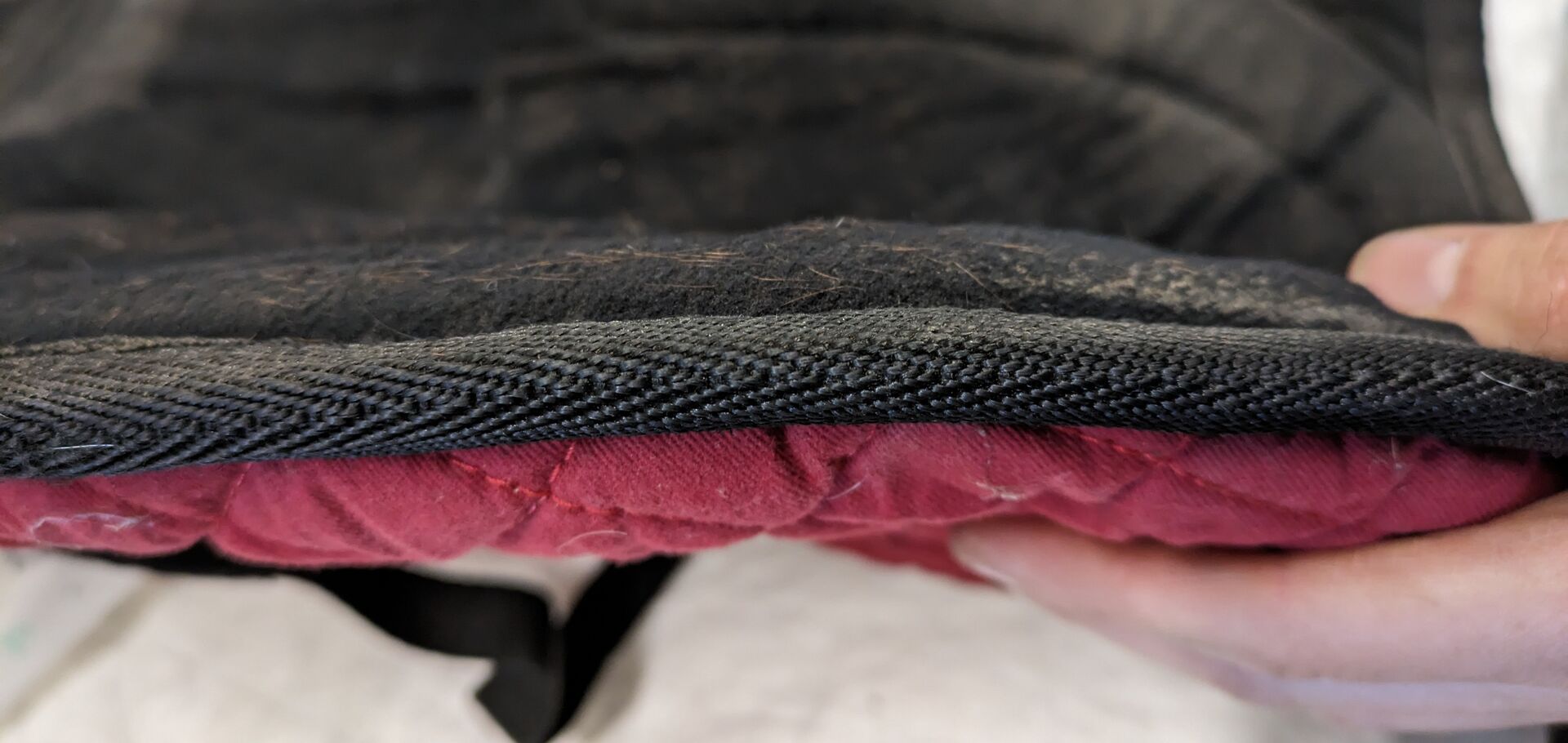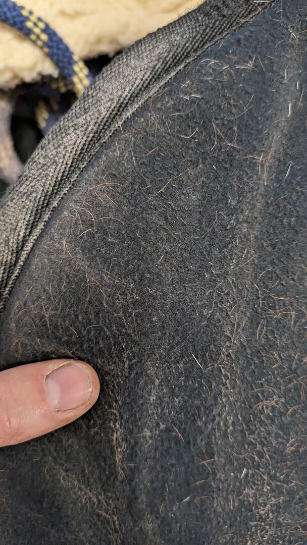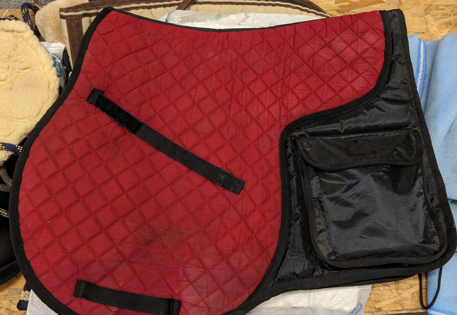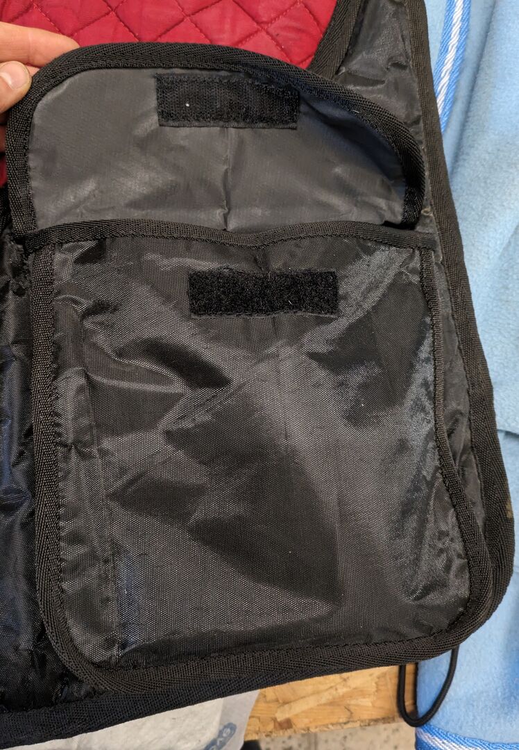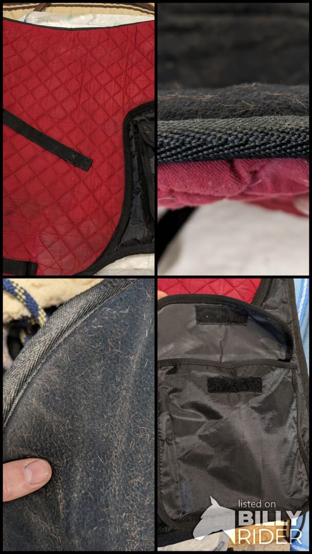 Die dick gefütterte Schabracke besitzt auf jeder Seite eine Tasche mit Klettverschluss. Eine kleine 0,33l Flasche und Zubehör für den Ausritt passt problemlos rein.