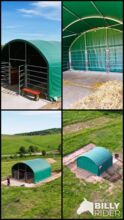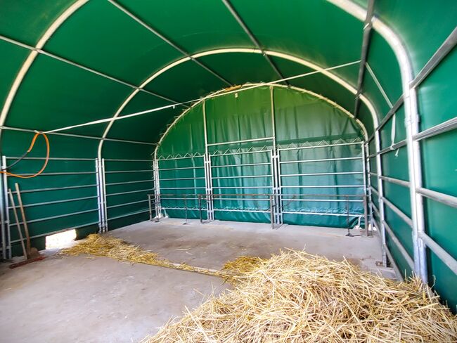Die stabile Konstruktion aus feuerverzinktem Stahl sorgt für hohe Langlebigkeit und Widerstandsfähigkeit im täglichen Einsatz. Die starke PVC-Plane ist wetterfest, strapazierfähig und für den Einsatz im Außenbereich bestens geeignet. Ein großer Vorteil dieses Modells ist der offene und vollständig nutzbare Innenraum ohne Innenpfosten. Dadurch kann die gesamte Fläche flexibel als Ruhebereich, Futterplatz oder Wetterschutz genutzt werden.