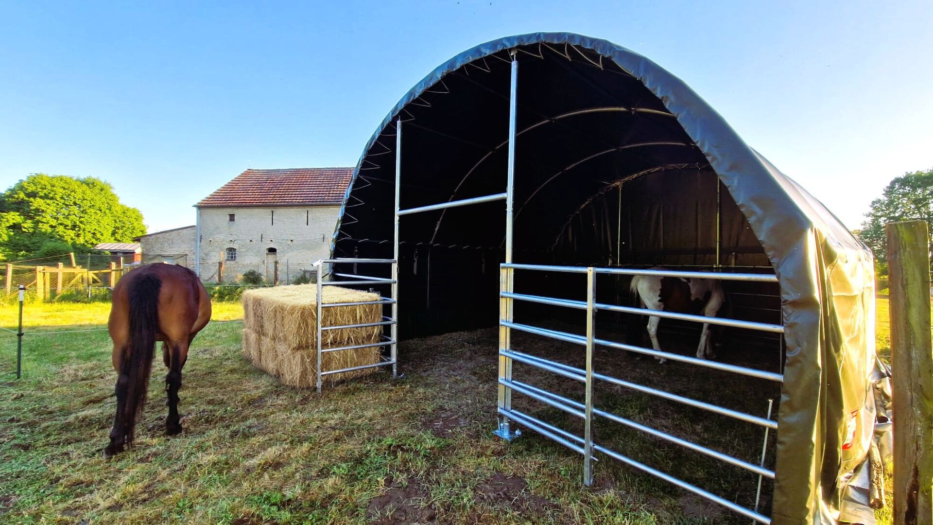 * Großzügige **6x6 m** Nutzfläche * **Premium-Ausführung** für den ganzjährigen Einsatz. * 900 g/m² PVC-Plane**. **UV-Schutz 50+**. * stabile **verzinkte Stahlkonstruktion**. *keine Innenpfosten** - 100 % nutzbarer Innenraum * Schnelle Montage * mobil und flexibel einsetzbar * ideal als Standplatz, Futterplatz oder Wärmequelle für Tiere.