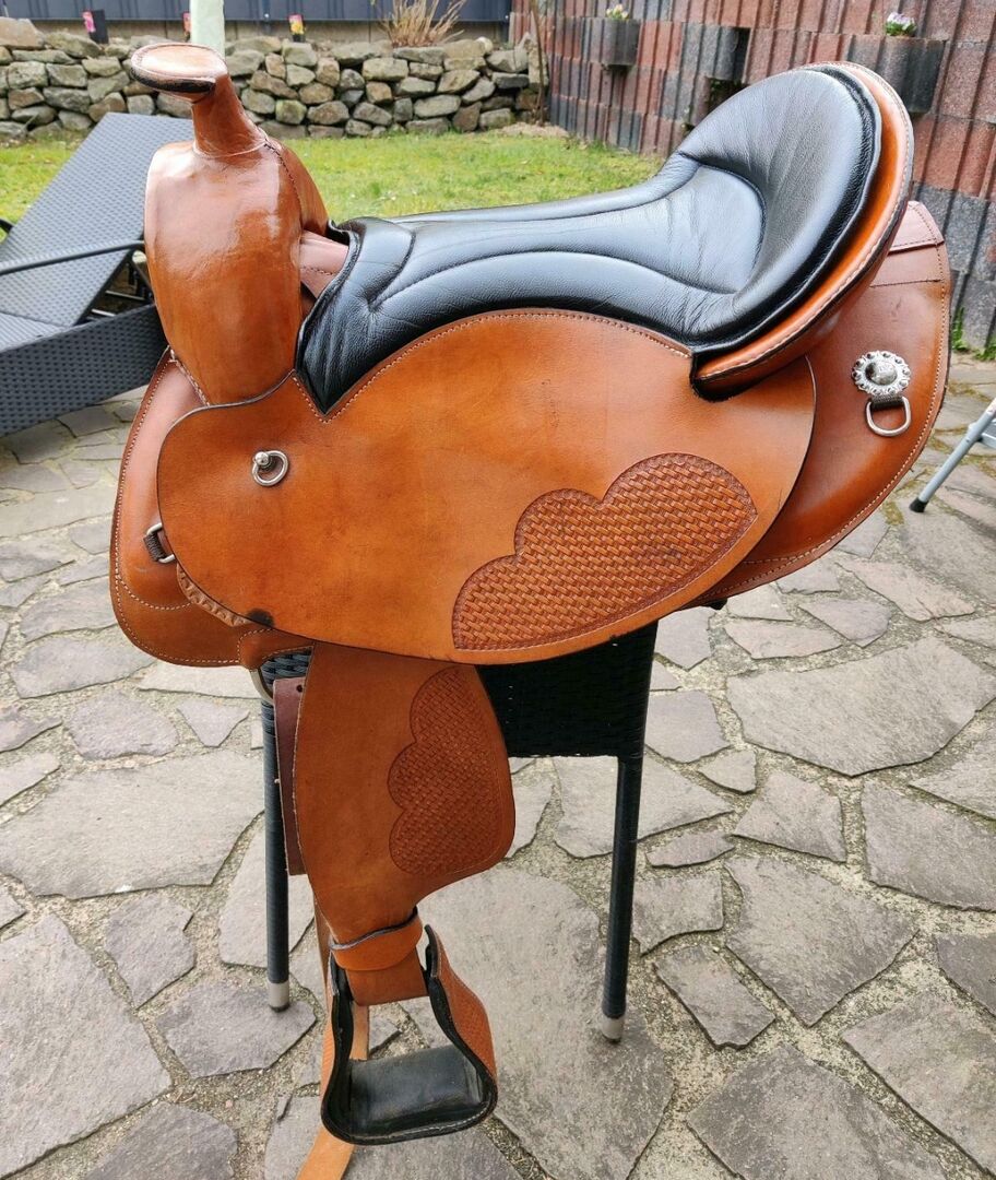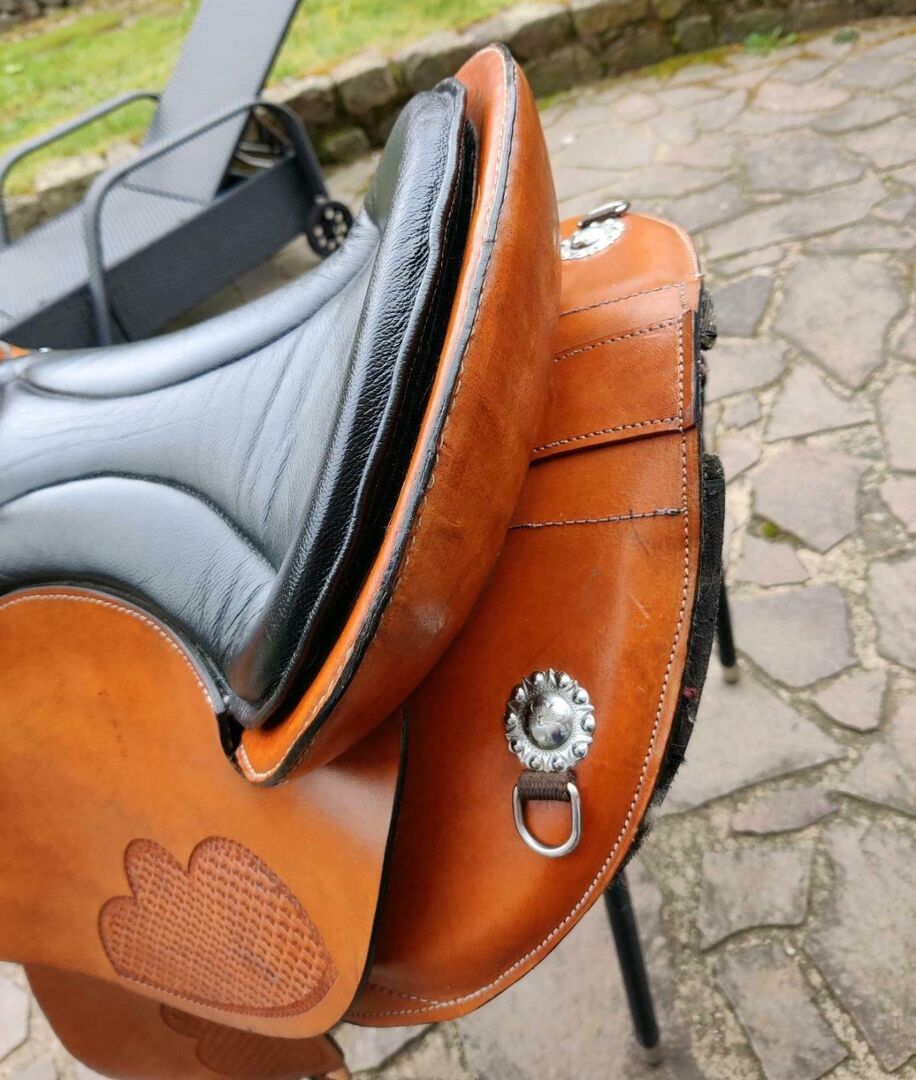 Biete einen selten genutzten baumlosen Westernsattel an. Er ist vergleichbar mit dem Startrek Deuber. Der Sattel besitzt Klettpolster, mit denen man den Sattel anpassen kann. Er liegt schön stabil, man sitzt nah am Pferd, kein schwammiges Gefühl, eher wie mit Baum. Die Fork ist austauschbar und auch für Pferde mit leichtem Schwung nutzbar. Der Sattel lag bei mir auf einem Traber. Auch für kurze Rücken geeignet, da Länge ca 60 cm, Sitzfläche ca 42 cm. Weitere Maße sind auf den Bildern zu sehen.