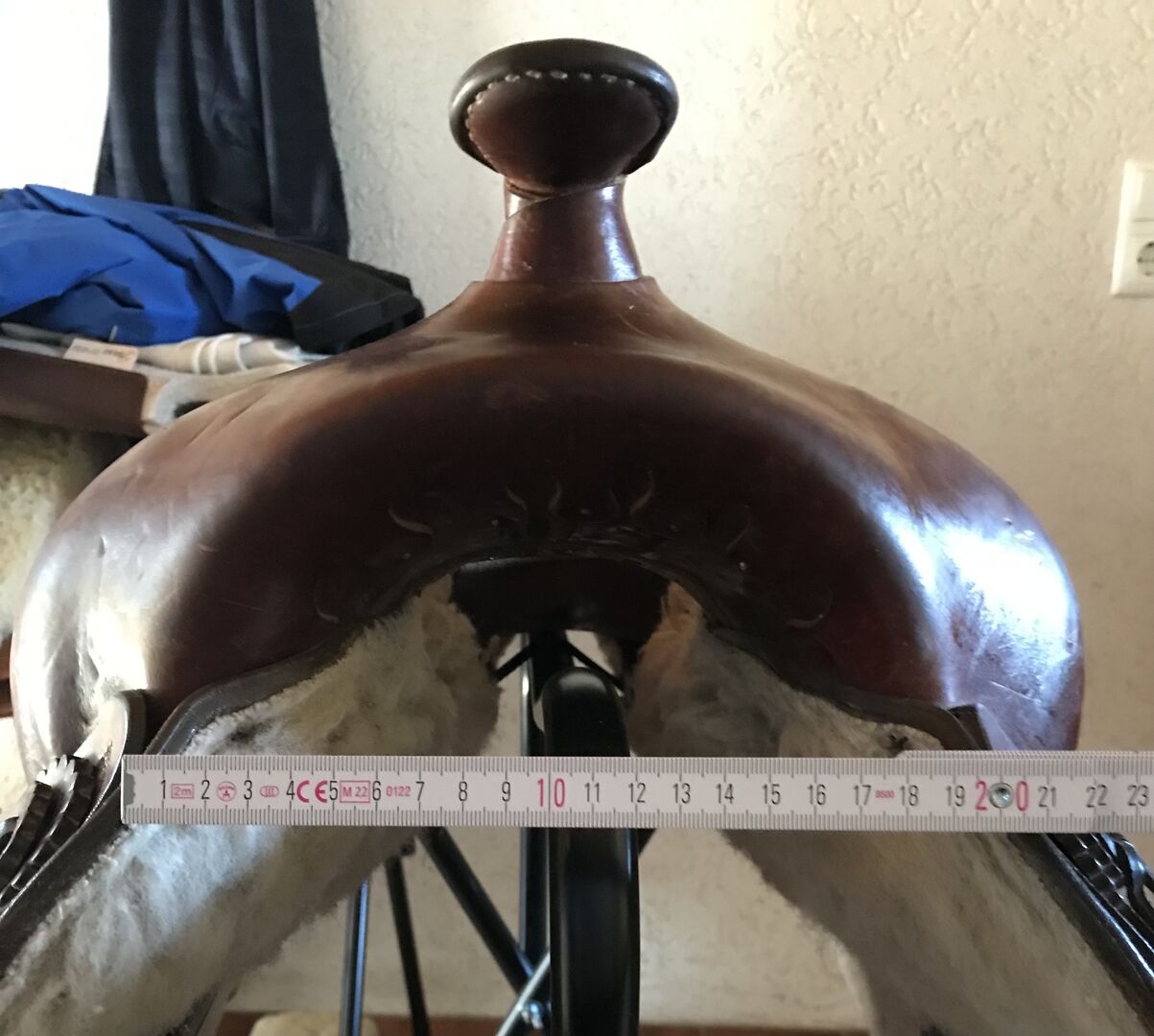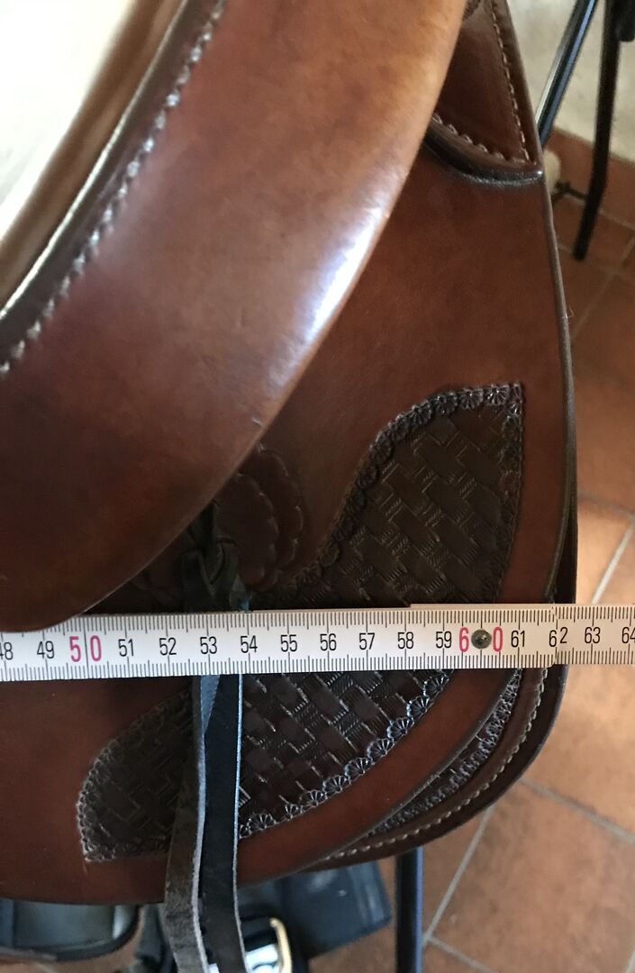 Normale Gebrauchsspuren vorhanden, aber sehr gepflegt. Aus hochwertigem weichen Leder, absoluter Qualitätssattel in schönem Braun. Sehr bequem zu sitzen, Sitzgröße 16, FQ, mittlerer Schwung, für breitere Pferde mit weniger Widerrist und starker Schulter geeignet, hier macht der Sattel schön auf. Aufgrund der Länge auch für kürzere Rücken. Passt auf viele Pferde, vom Quarter bis zum Norweger. Bei Fragen, einfach melden :)
