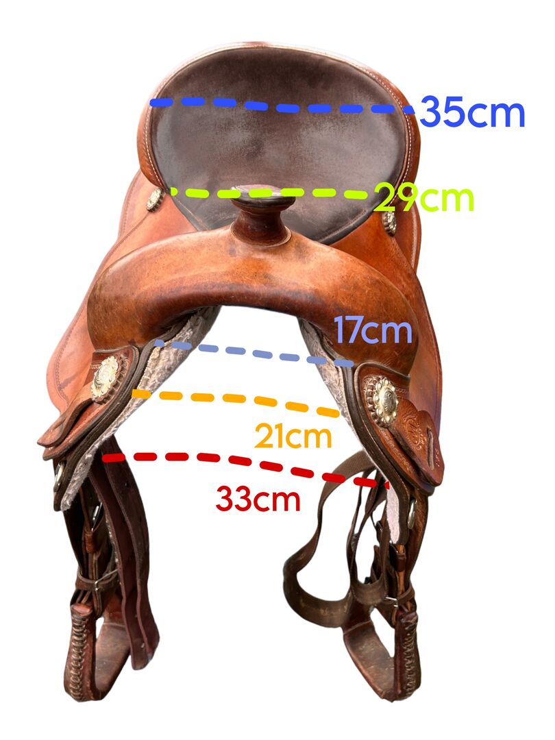 Inkl. Fender, Steigbügel, Off Billet und Tie Strap. Der Sattel ist wirklich sehr bequem (Sitzgröße ca. 16,5). Er eignet sich auch hervorragend für Pferde mit etwas kürzerem Rücken (Full Quarter). Gesamtgewicht nur ca. 12kg. Neupreis lag wohl bei 1.800,-.