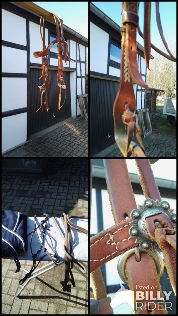 *Western-Trense* - Trense für ein Großpferd mit Verzierungen in gutem Zustand, ohne Gebiss. Bei Interesse habe ich auch noch einen Sack schmackhaftes Pferdefutter für die tägliche Gabe geeignet. Mit Wasser vermengen, Pferd Putzen, füttern (20 Minuten Einweichzeit)Mischung aus Luzerne, Rübenschnitzel, Leinextraktionsschrot, Leinöl ... 15 Kilo 15,- € Versand möglich