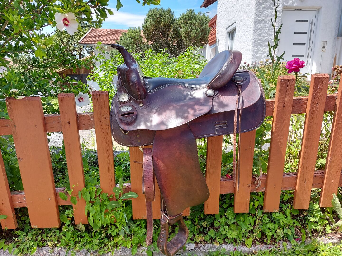 Westernsattel zum Verkauf an. Er ist wie gesagt schon älter und hat auch dementsprechend Gebrauchsspuren. Die Funktionstüchtigkeit wird aber dadurch nicht eingeschränkt, es handelt sich nur um optische Mängel. Es ist das Modell 1347. Ein Tie-Strap und ein Off-Billet aus Leder sind mit dabei.