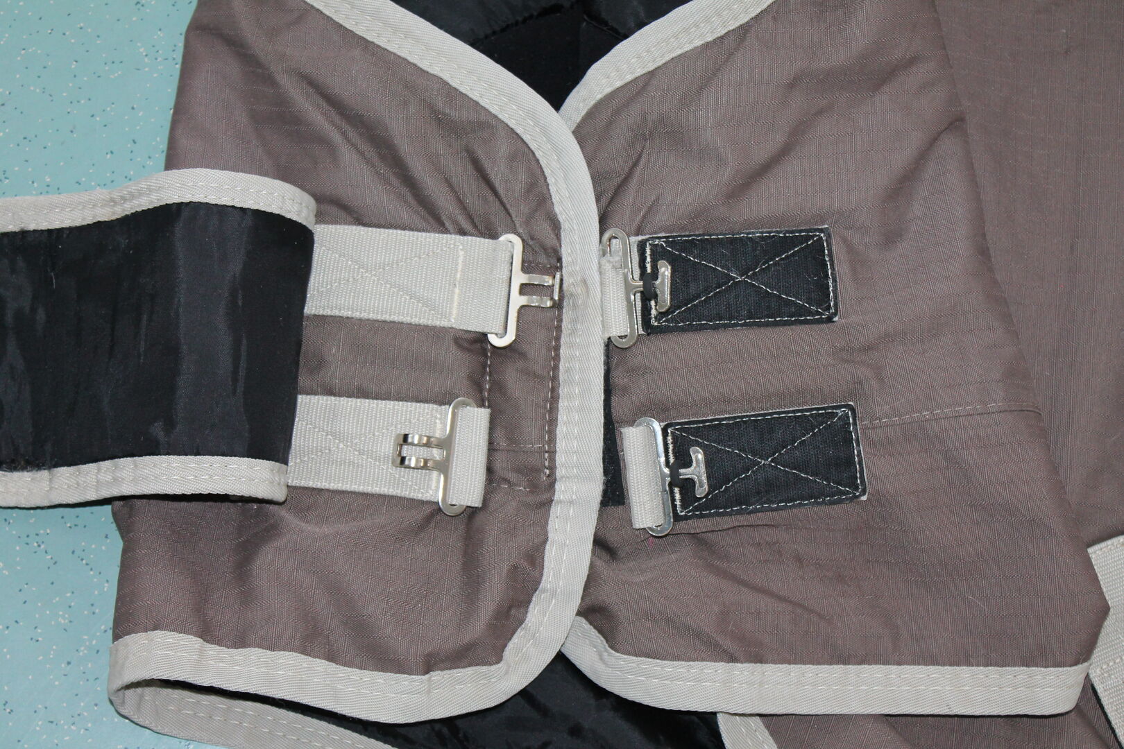 Sehr robuste und warme Winterdecke "Thermo Star Premium",Gr. 155, Wattierung mit 200 Gramm, atmungsaktiver, wasserabweisender und robuster Oberstoff, im gefütterten Bereich ist die Decke mit Fleece ausgekleidet, Schweiflatz, Edelstahl-Verschlüsse, vorne zwei Hacken-Verschlüsse mit Überlappung aus Stoff, unten rum ist die Decke nur mit Taft gefüttert, Decke wurde fachmännisch gereinigt und auch imprägniert, die Schimmelhaare wurden soo gut wie möglich entfernt, vom Paddock Spezl sind zwei gaanz kleine Löchlein, diese wurden mit speziellen Pads repariert, ebenso ist eine kleine Stelle an der Einfassung der Decke nachgenäht worden, Rundum eine gute und robuste Winterdecke, sauber und geruchsneutral ! ca. 2 Jahre alt.