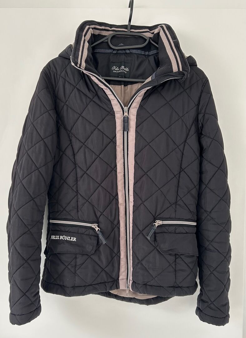 Die Jacke ist gesteppt, mit Futter und Wattierung Abnehmbare Kapuze Marke: Felix Bühler Farbe: schwarz, innen taupe Größe: S Vorne Reißverschluss Zwei Reissverschluß- und zwei Einstecktaschen mit Knöpfen vorne Material:100% Polyester Maschinenwaschbar