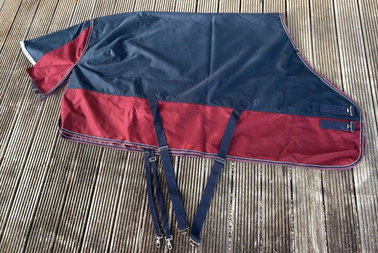 Verkaufe die abgebildete Winterdecke in rot-blau, Größe 135 cm, Füllung: 50 g, mit Widerristpolster, Ösen für ein Halsteil und Beinschnüren. Leichte Gebrauchsspuren. Neupreis: 94,90 Euro Privatverkauf: kein Umtausch, keine Rücknahme