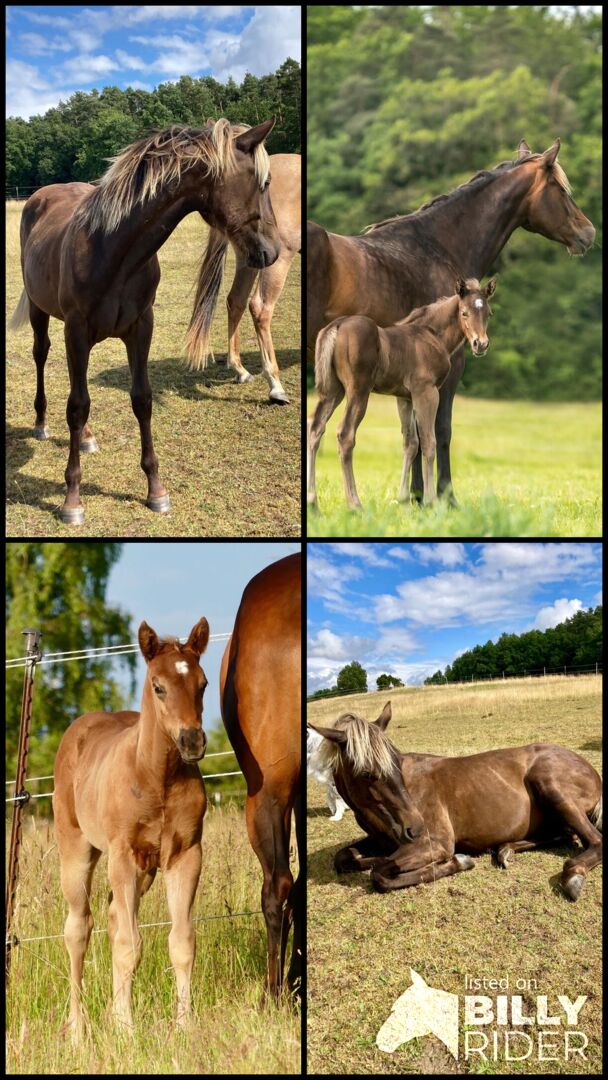 Dads Silver Princess -- da ist der Name Programm. Die Quarter Horse Stutfe ist eine kleine Prinzessin. Erst etwas schüchtern, aber wenn man sie für sich gewonnen hat, geht sie mit einem durch dick und dünn. Sissi weiß ganz genau, was sie will. Sie ist 5.24 geboren und wird ein geschätztes Endmaß von 150 bis 155 cm bekommen. In der tollen Farbe silver bay, E/E und A/a. Sie wird eher großrahmig. Sissi liebt es im Galopp unterwegs zu sein und kann sich super bewegen. Daher auch sehr interessant für Working Equitation. Sie wächst mit Gleichaltrigen auf und kennt bei Abgabe das Fohlen 1×1. Das Stutfohlen hat einen Foundationanteil von 87 %. Der Vater ist der Silver Dapple QH Hengst Silver Apache Joe, 11,7 % Hancock gezogen. Sissis Mutter ist ebenfalls Hancock gezogen. Ein absoluter Eyecatcher für Freizeit und mehr. Inklusive einer Lebensversicherung. Mehr Bilder und Videos auf Anfrage.