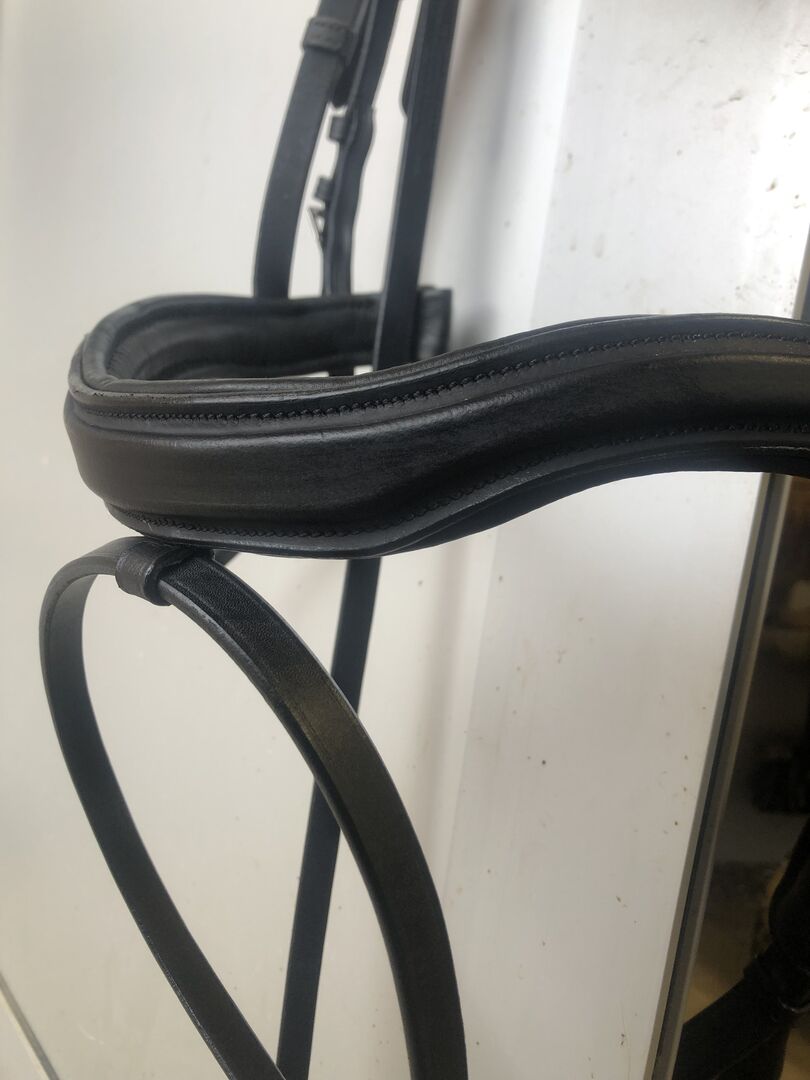 Zur Anprobe getragener Zaum Anatomic Crystal in schwarz, grösse Full Nasen- und Stirnriemen weich unterlegt ohne Gebiss Qualitätsleder gepolsterter Stirnriemen Umlenk-Verschnallung Zügel aus gewebtem Band mit extra kleinem Stopperabstand breites Genickstück mit Ohrenausschnitt