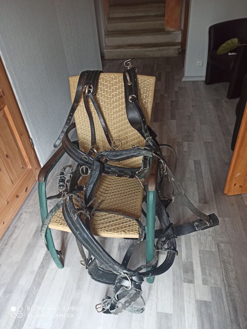 Es fehlen die Kopfstücke und Schweifriehmen. Selett, Brustblatt und Stränge sind vollständig.