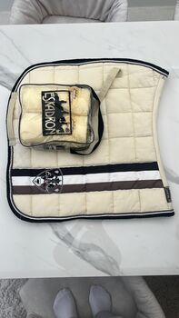 Fleecebandagen in der Farbe cremeweiß, Größe Full, noch nie getragen. Die passende Schabracke kann auch erworben werden (siehe Foto, Inserat ist on